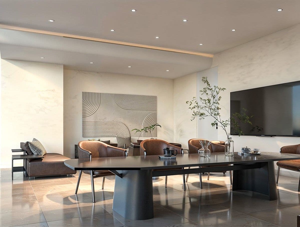 This office interior was designed as a refined and functional workplace, balancing professionalism with a welcoming atmosphere. Clean lines, warm material tones, and layered lighting define the space, while glass partitions maintain openness and visual continuity. Dedicated meeting rooms, collaborative areas, and executive offices are integrated to support daily operations and client interaction in a contemporary setting.